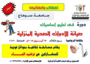 تنظم الإدارة العامة لرعاية شباب المركزية دورة في تعليم أساسيات صيانة الأدوات الصحية والمنزلية لطلاب وطالبات الجامعة وذلك يوم الثلاثاء الموافق 17 أبريل الجاري بالقاعة الزجاجية بالحرم الجامعي القديم.