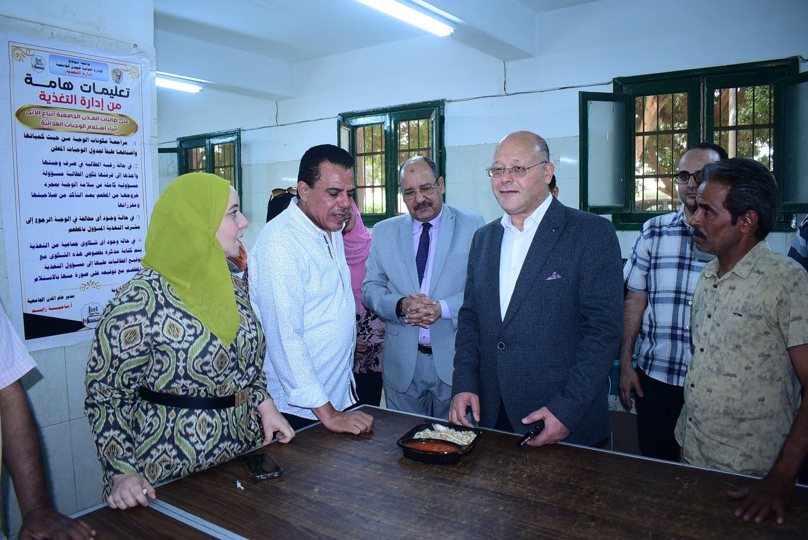 ومن جانبه قال حامد الخولى، أن رئيس الجامعة قام بمرور مفاجئ على مطعم المدينة الجامعية للطالبات، وتفقد مراحل إعداد الوجبات الغذائية التى تقدم لهن، وتأكد من مدى كفاءة ونظافة المعدات المستخدمة، والتزام العاملين باشتراطات الأمن والسلامة، كما وجه بتوفير الخبز الملائم لتغذية الطالبات، وعدم التأخر في تقديم الوجبات فى مواعيدها المحددة، مضيفاً أن رئيس الجامعة تفقد أيضاً المغاسل الخاصة بالمدن، إلى جانب تفقد وحدة “السلندر” التى تم احلالها وتزويدها بغلاية المياة الساخنة بتكلفة 350 الف جنيه، والتى تم تركيبها حديثا بمبنى (أ)، لرفع كفاءة المياه الساخنة بدورات المياه داخل المبنى، مشيراً إلى أن رئيس الجامعة وجه بسرعة الانتهاء من جميع التجهيزات وعمليات التطوير والتجديد بكافة المدن الجامعية قبل انطلاق العام الجامعي الجديد.