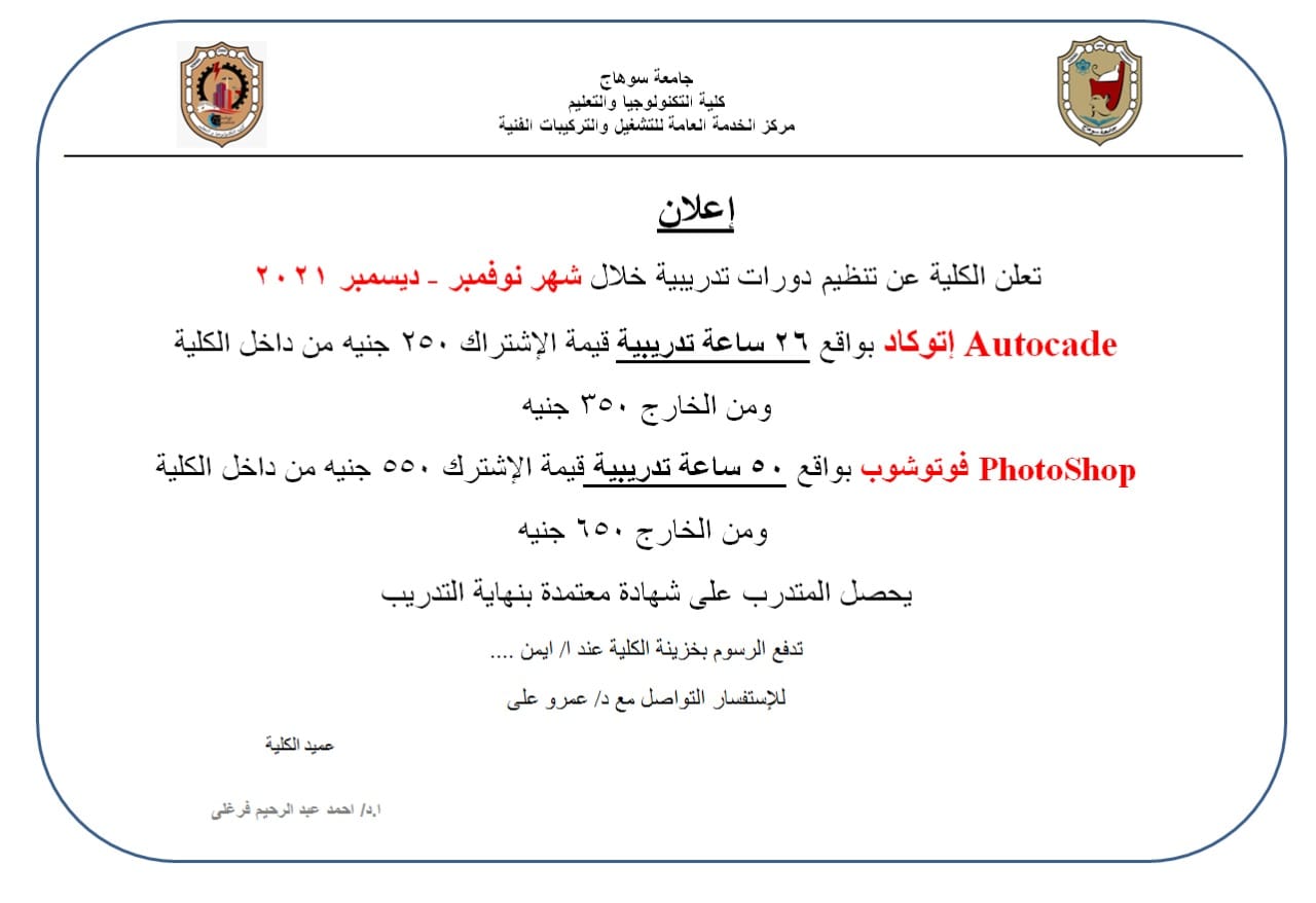 بواسطة walaa mazeedنشر على 25 نوفمبر, 2021نشر في اخبار وفعاليات الكلية اعلان عن دورات تدريبية ” فوتوشوب – إتوكاد “ تصفّح المقالات جامعة سوهاج تخصص مليون و٦٦٠ ألف جنيه كمرحلة أولى لسداد الرسوم الدراسية لعدد ١٩٢٩ طالب من التكافل الإجتماعي٢٨ نوفمبر..زيارة رسمية للمشروعات الإنشائية والمستشفى الجامعي الجديد بسوهاج*