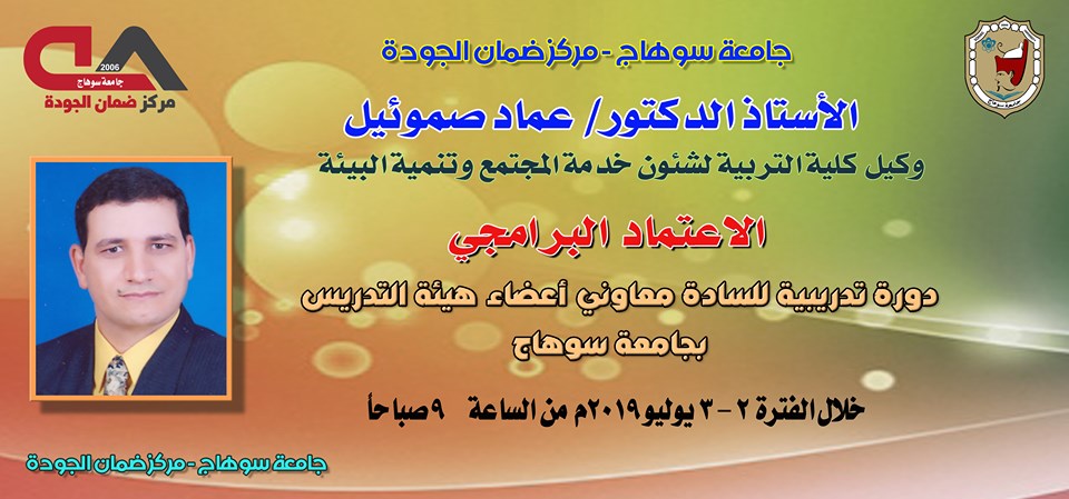 يعلن مركز ضمان الجودة بجامعة سوهاج عن عقد  “الاعتماد البرامجي ” – دورة تدريبية للسادة معاوني أعضاء هيئة التدريس  خلال الفترة 2-3 يوليو من الساعة 9 صباحا بمركز ضمان الجودة .