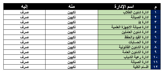 - التوقيع على إخلاءات طرف لأى عضو هيئة تدريس ومعاونيهم وأمناء المعامل بالكلية وذلك بعد التأكد من نقل جميع العهدة التي طرفة لأى شخص أخر بنفس القسم على استمارة موضحة بها الاصناف المنقولة والكمية .
