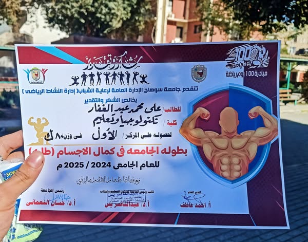 لفوزه بالمركز الأول والميدالية الذهبية في بطولة جامعة سوهاج لرياضة كمال الأجسام