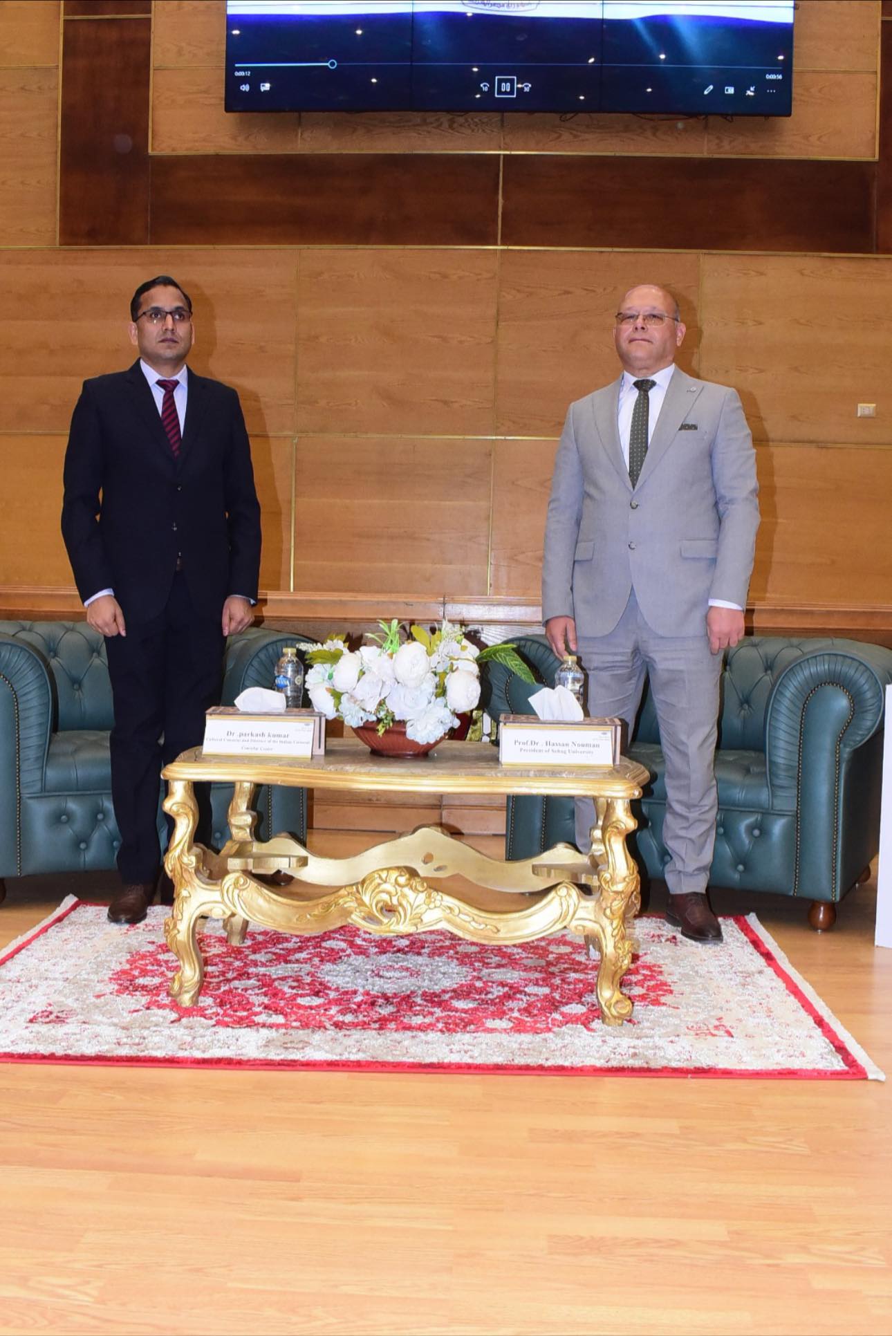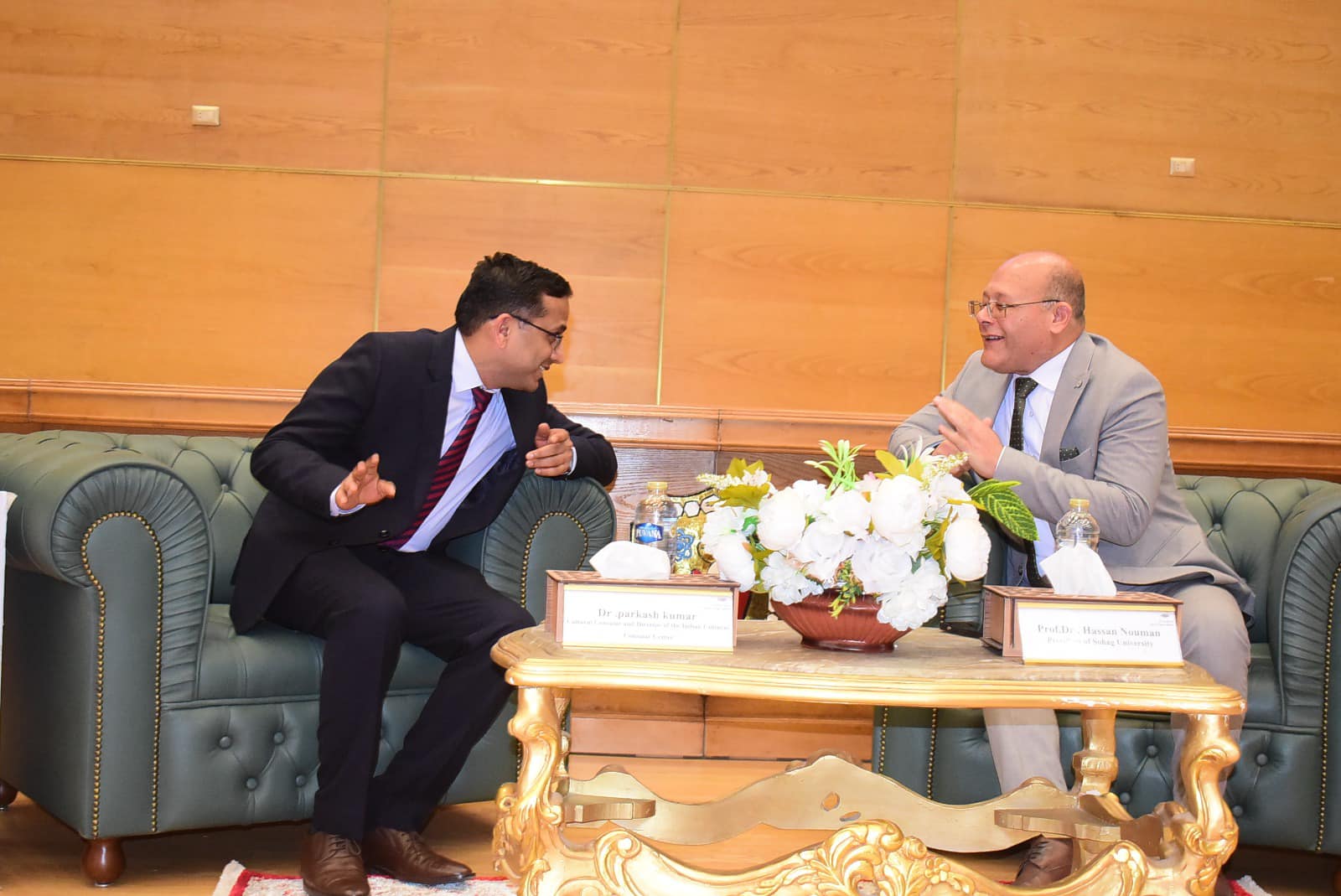 ومن جانبه، وجه المستشار الثقافي لسفارة الهند، الدكتور بركاش كومار، شكره وتقديره للدكتور حسان النعماني على حسن الاستقبال في جامعة سوهاج، مشيداً بما شاهده من انجازات وطفرة انشائية متميزة، وسعادته بتواجده بوسط ابنائه الطلاب، على أن الهند ومصر هما من أعظم الحضارات في العالم، حيث يعود تاريخ التبادل الثقافي بين الحضارتين العظيمتين الى العصر الفرعوني، مرحباً بعقد مزيد من بروتوكولات التعاون مع الجامعة واستمرار التعاون بين الجانبين.