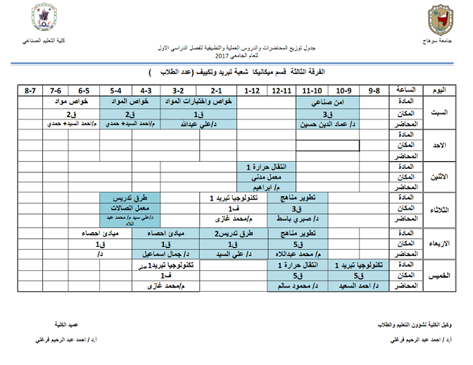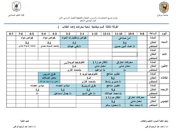 جدول الفرقة الثالثة ميكانيكا - انتاج