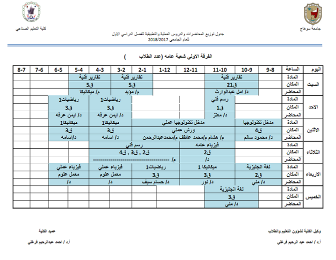 بواسطة walaa mazeedنشر على 15 سبتمبر, 2017نشر في اخبار وفعاليات الكلية جدول المحاضرات الدراسية للفرقة الأولى لعام 2017\ 2018 تصفّح المقالات جدول المحاضرات الدراسية لقسم ( الميكانيكا) لعام 2017\ 2018جدول المحاضرات الدراسية لقسم الكهرباء لعام 2017\ 2018