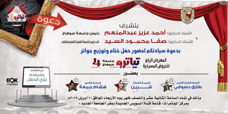 تنظم، اليوم،  الإدارة العامة لرعاية الشباب بجامعة سوهاج حفل ختام  المهرجان الرابع للعروض المسرحية بعنوان ” تياترو 4″  في تمام الساعه الثانية عشر والنصف ظهرًا بمركز المؤتمرات قاعة قناة السويس الجديدة بمقر الجامعة الجديد.