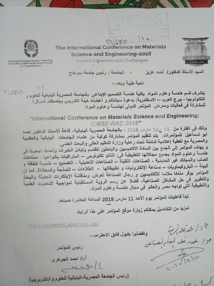 بواسطة walaa mazeedنشر على 26 ديسمبر, 2017نشر في اخبار وفعاليات الكلية للتسجيل في حضور المؤتمر برجاء التوجه الي رعاية الشباب دعوة للمشاركة في المؤتمر الدولي للهندسة وعلوم المواد من الجامعة المصرية اليابانية للعلوم والتكنولوجيا تصفّح المقالات بتكلفة 120 ألف جنيه وحدتين لخلع الملابس بملاعب جامعة سوهاجطرح مناقصة عامة لإنشاء شبكة المعلومات بجامعة سوهاج الجديدة.