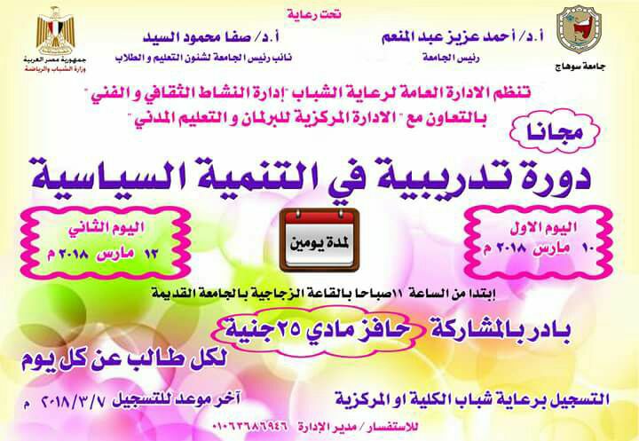 بواسطة walaa mazeedنشر على 6 مارس, 2018نشر في اخبار وفعاليات الكلية دورة تدريبية في التنمية السياسية تصفّح المقالات اليوم.. ختام بطولة تنس الطاولة للمدن الجامعية بسوهاج106 ”كيس دم” من جامعة سوهاج لمرضي الأورام واطفال الثلاسيميا