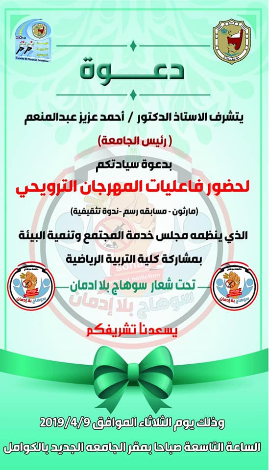 وأضافت الدكتورة صباح صابر منسق المهرجان أنه سيتم تنظيم مسابقة فنية في الرسم بمشاركة ٣ طلاب من كل كلية لاختيار أفضل شعار للمهرجان، وتنتهي فعاليات المهرجان بعقد ندوة تثقيفية عن الإدمان يحاضر بها الدكتور هاني جميعة وكيل وزارة الصحة بسوهاج، يلي ذلك توزيع الجوائز للطلاب الفائزين بالمراكز الأولى في مسابقات الجري والرسم، للطلاب تقديم العديد من المعلومات للشباب المشارك حول تصحيح الأفكار والمعتقدات المغلوطة المترتبة على تعاطى المواد المخدرة.