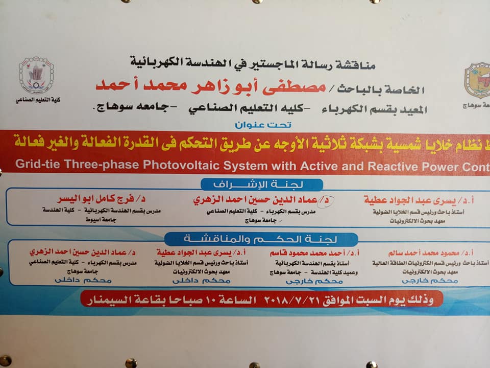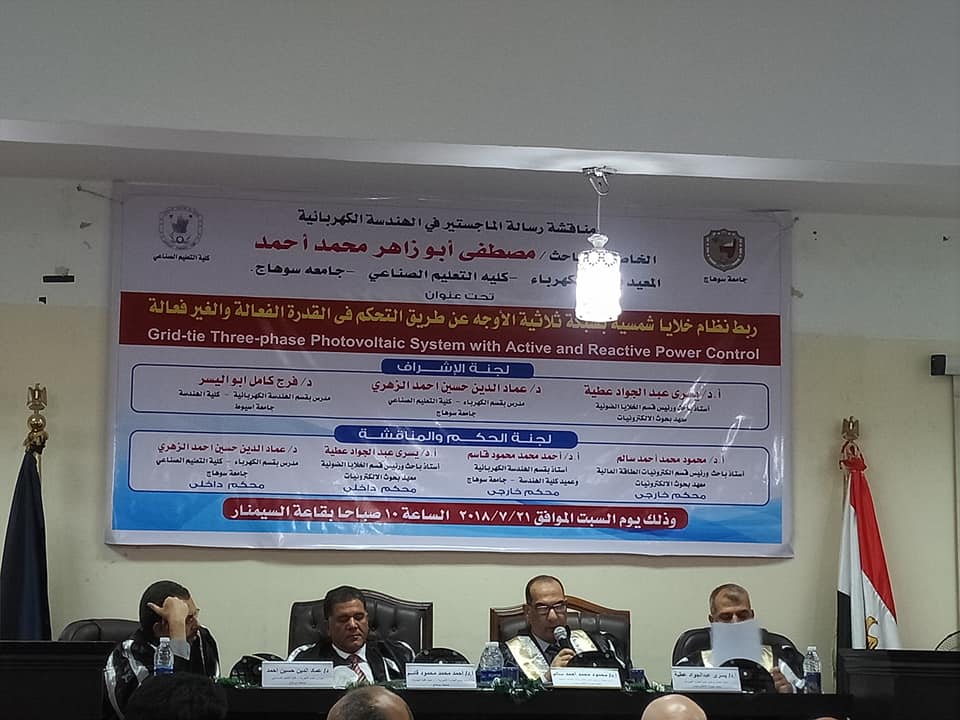 ناقشت كلية التعليم الصناعي بجامعة سوهاج، اليوم،رسالة علمية لنيل درجة الماجستير في هندسة الكهرباء ، بعنوان ” ربط نظام خلايا شمسية بشبكة ثلاثية الأوجة عن طريق التحكم في القدرة الفاعلة والغير فعالة ”  بقسم الكهرباء ،مقدمة من الباحث  مصطفى ابو زاهر محمد ، جاء ذلك في قاعة السمينار بالكلية  بإشراف :