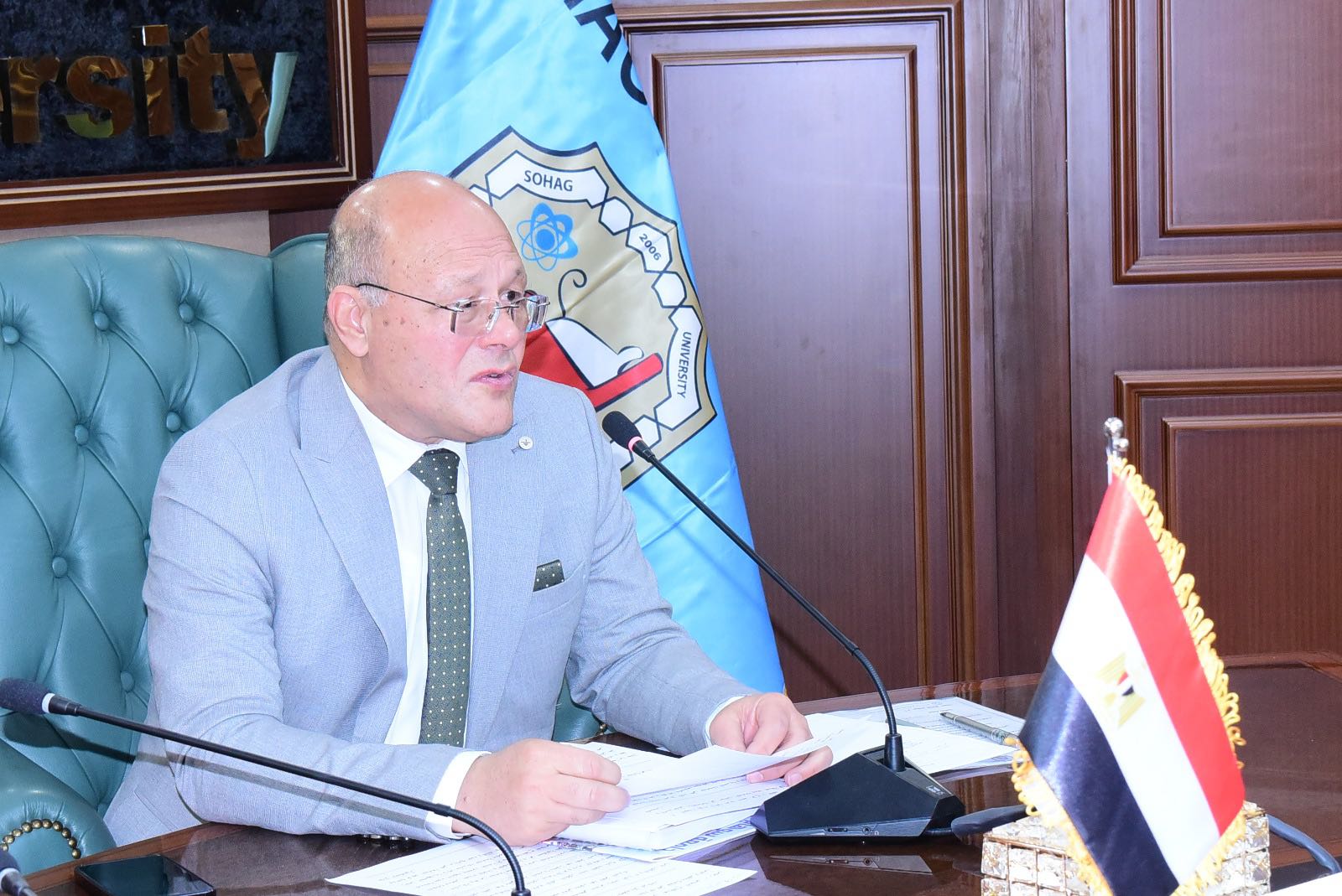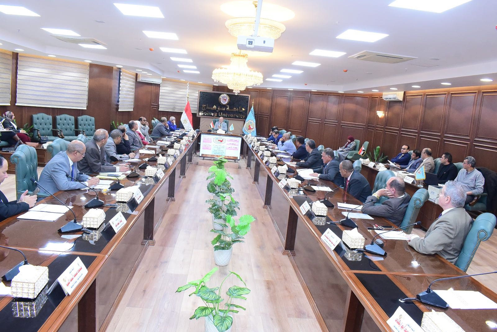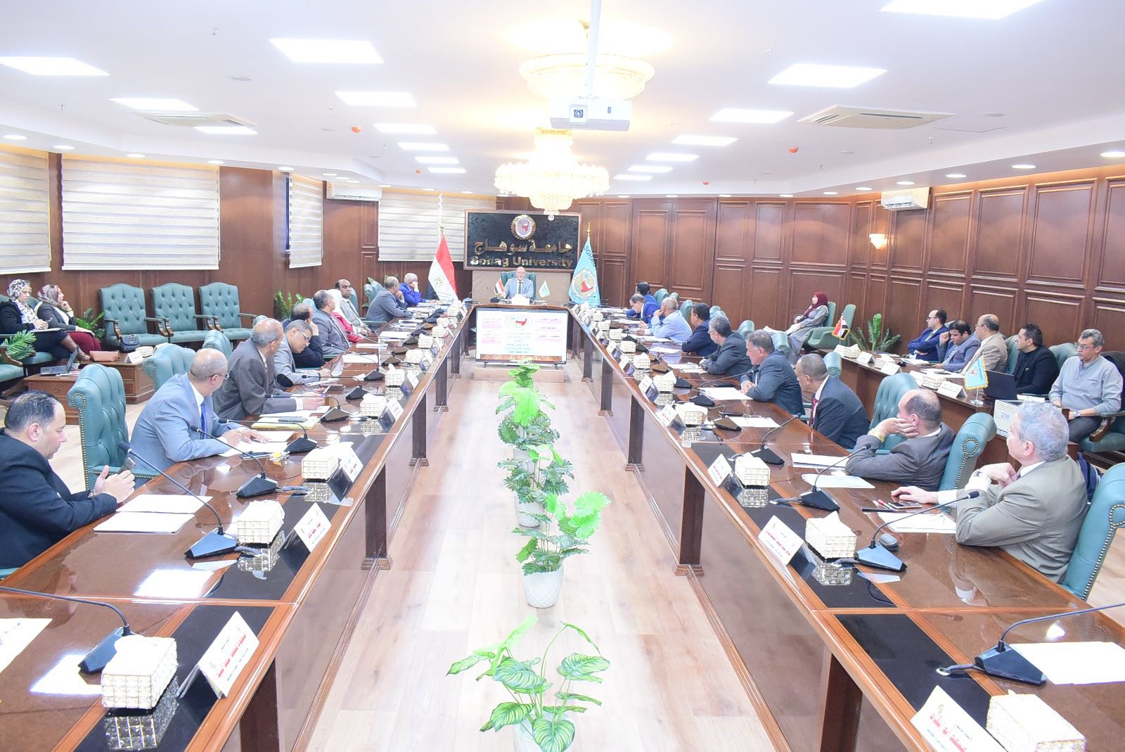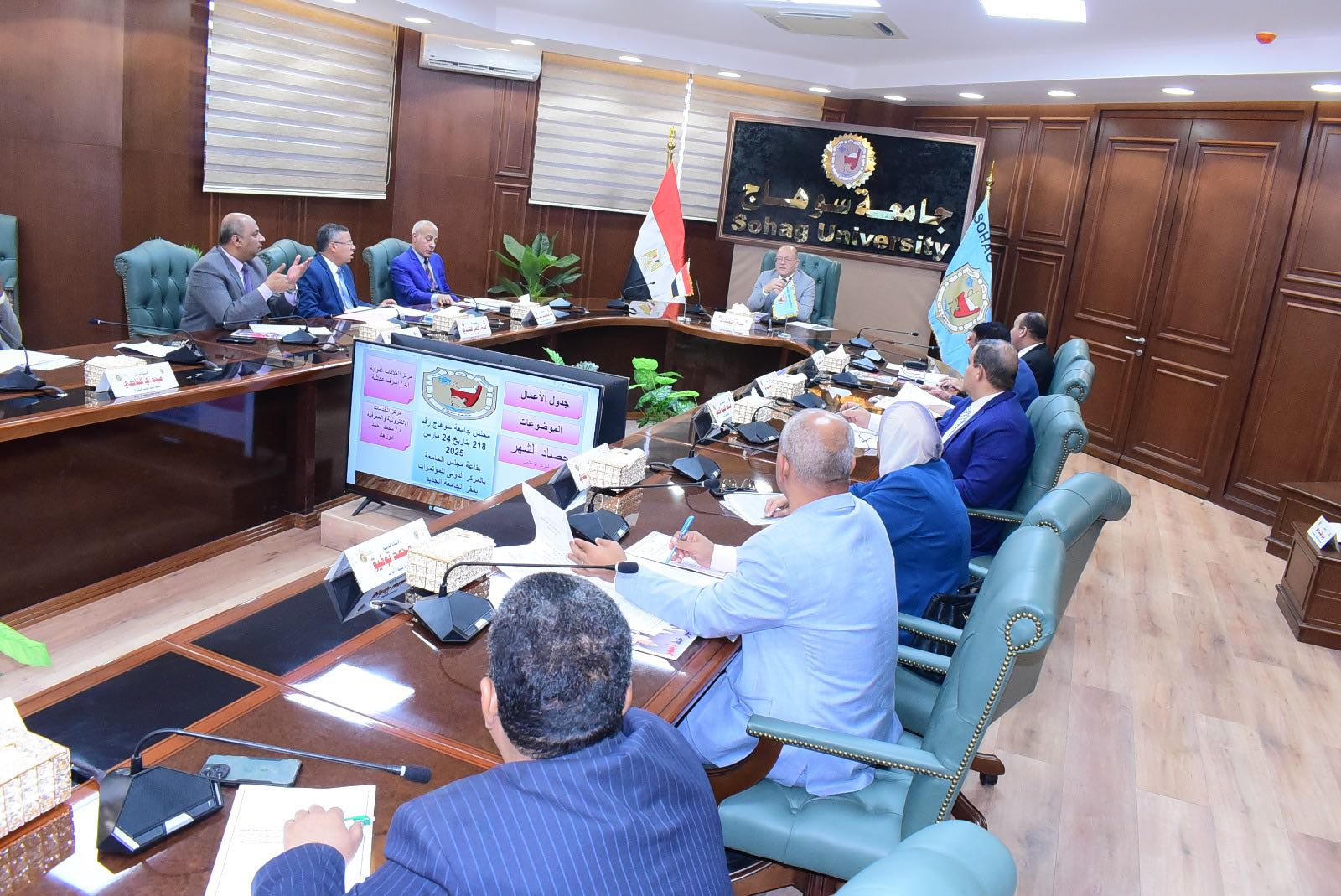 عقد مجلس جامعة سوهاج جلسته رقم ٢١٨ لشهر مارس ٢٠٢٥ برئاسة الدكتور حسان النعماني، رئيس الجامعة، وحضور الدكتور عبدالناصر يس، نائب رئيس الجامعة لشؤون التعليم والطلاب، والدكتور خالد عمران، نائب رئيس الجامعة لشؤون خدمة المجتمع وتنمية البيئة، والمحاسب أشرف القاضي، أمين عام الجامعة، وعمداء الكليات.
