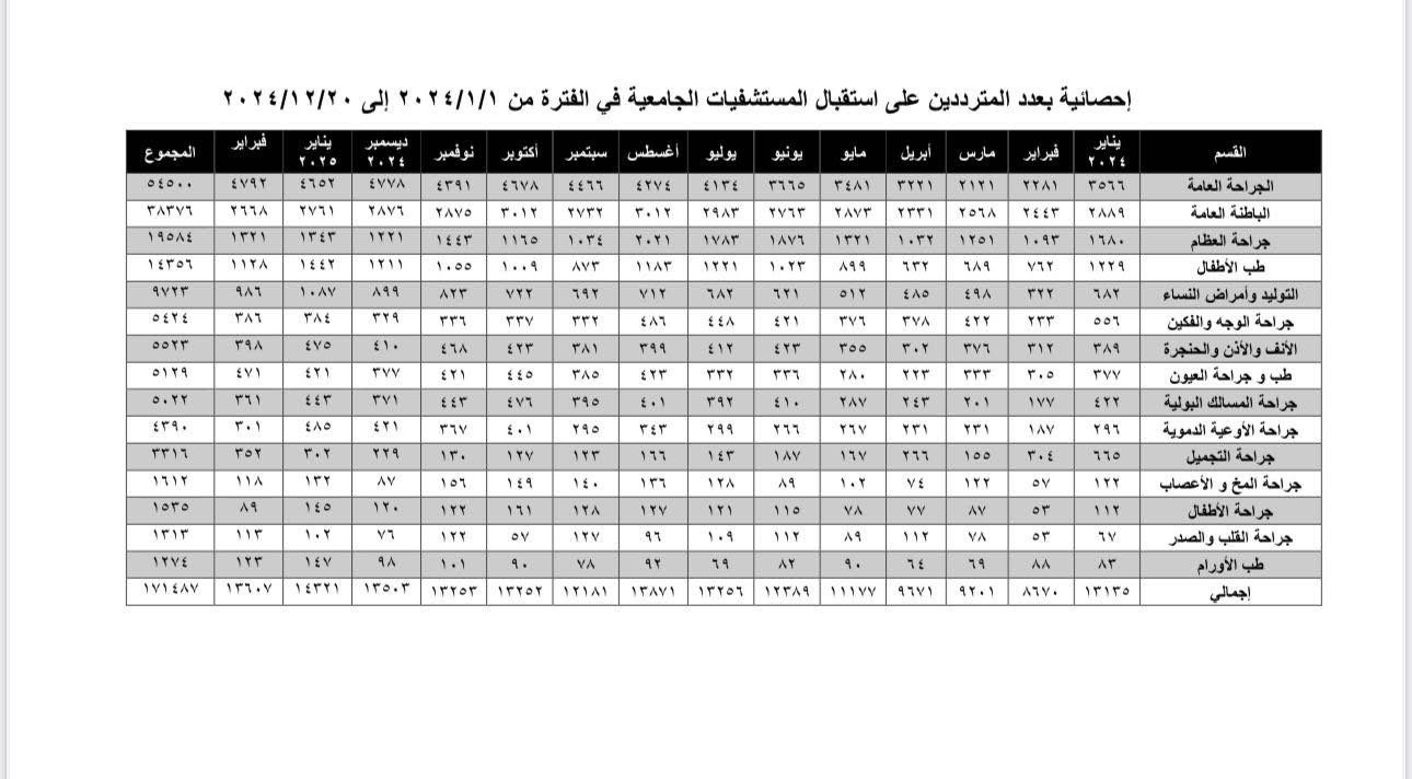 وفيما يلي إحصائية بعدد المترددين علي الأقسام المختلفة بالمستشفيات الجامعية: