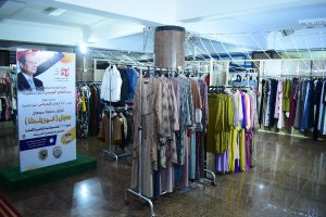 ان المعرض يضم عدد كبير من قطع الملابس والأقمشة مختلفة الأنواع، والتي يتم توزيعها على الطلبة والطالبات حسب المقاسات واختياراتهم للملابس.